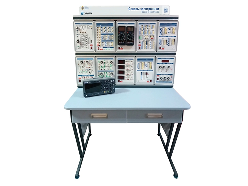 Комплект учебно-лабораторного оборудования "Основы электроники" (далее – стенд) предназначен для проведения лабораторно-практических занятий по курсу "Основы электроники" и обеспечивает изучение диодов, параметрических стабилизаторов напряжения; биполярных и полевых транзисторов, транзисторных усилительных каскадов на их основе; тиристоров, симисторов, запираемых тиристоров, управляемых и неуправляемых выпрямителей, различных видов преобразователей переменного напряжения; различных схем на базе операционных усилителей: инвертирующего и неинвертирующего усилителя, интегратора, компаратора и мультивибратора; оптоэлектронных приборов; комбинационных и последовательностных цифровых интегральных микросхем; счетчиков, сумматоров, регистров, дешифраторов, мультиплексоров, а также схем аналого-цифровых и цифро-аналоговых преобразователей (АЦП и ЦАП).
