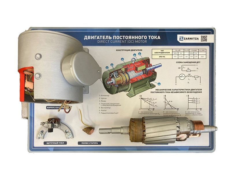 На лицевой панели основания нанесено полноцветное изображение конструкции двигателя постоянного тока.