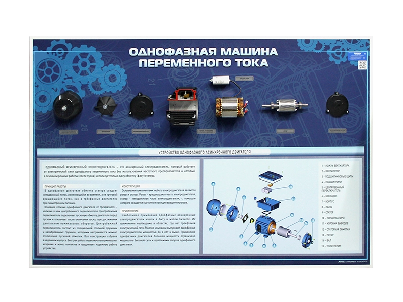 Стенд предназначен для наглядного отображения конструкции и принципа работы однофазной машины переменного тока.