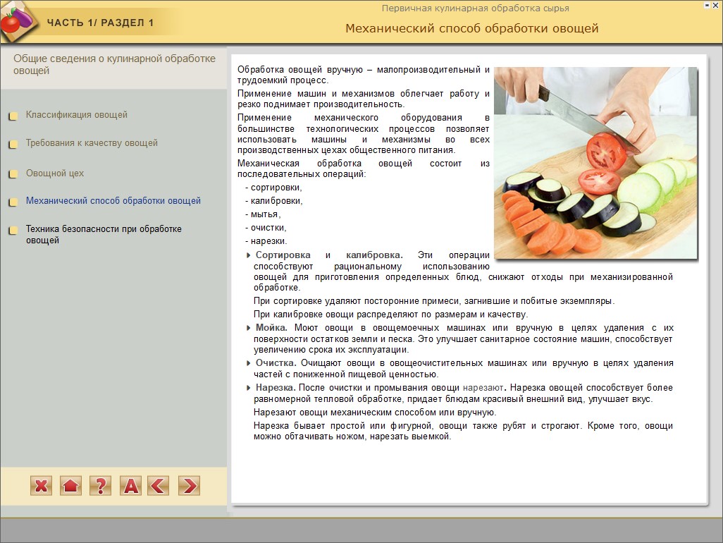 Учебное видео (средняя продолжительность видео – 15 мин, по каждой теме сформирована подборка из нескольких видеофрагментов, которая включает подготовку рабочего места повара, приготовление блюда, демонстрацию блюд данной классификации):