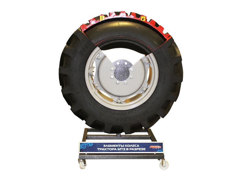 Стенд представляет собой металлическое основание с установленным на поверхности колесом трактора МТЗ в разрезе.