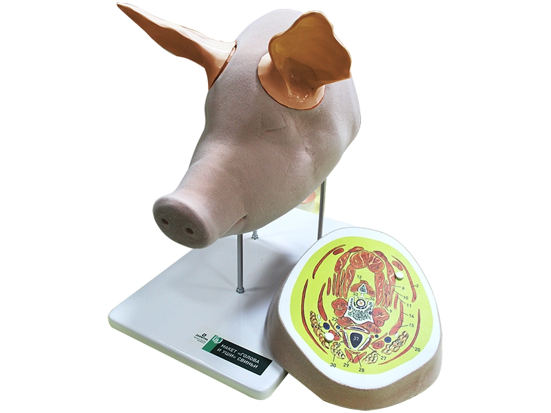 Данный макет представляет собой, анатомически верную модель свиной головы. С помощью макета наглядно показана внешняя анатомия головы свиньи с графическим отображением внутренней структуры тканей на съемном модуле оболочки шеи. Макет предназначен для обучения навыкам биркования ушей свиней путем выполнения стандартных процедур с ушными раковинами. Съемные имитаторы ушных раковин, обладают быстросъёмным механизмом крепления к базовому макету, а также имитируют крупные кровеносные сосуды для определения места установки ушной бирки. Макет выполнен с высокой степенью реалистичности и детализации с соблюдением всех пропорций и масштабов, цветовое решение элементов макета приближено к оригиналу.