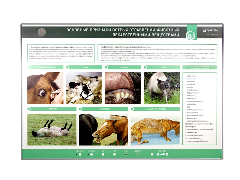 Электрифицированный стенд "Основные признаки острых отравлений животных лекарственными веществами" представляет собой полноцветную светодинамическую панель, на которой наглядно показаны основные признаки острых отравлений животных лекарственными веществами. В конструкцию учебного оборудования интегрированы высокочувствительные сенсоры для управления стендом при помощи интерактивного воздействия приемо-передающих устройств. Предусмотрено два режима работы со стендом: "Обучение" и "Контроль".
