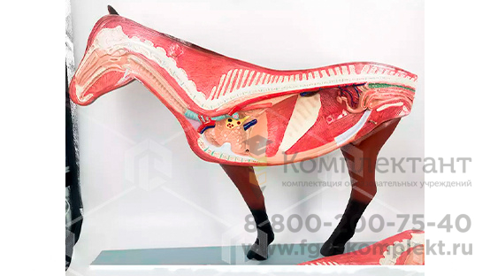 Интерактивный учебный комплекс предназначен для подготовки специалистов ветеринарного профиля и позволяет отработать общие вопросы внешнего и внутреннего анатомического строения лошади, а также строение внутренних органов и их расположение. Стенд представляет из себя модель лошади из пластика, установленную на скрытом металлическом основании в уменьшенном масштабе. Внутренние органы лошади, выполненные из пластика, могут быть закреплены внутри туловища на магнитные держатели. Макет оснащен подсветкой и магнитными датчиками на каждом из органов, при поднесении специализированной указки начинается воспроизведение звукового фрагмента с описанием строения данного органа на русском языке.