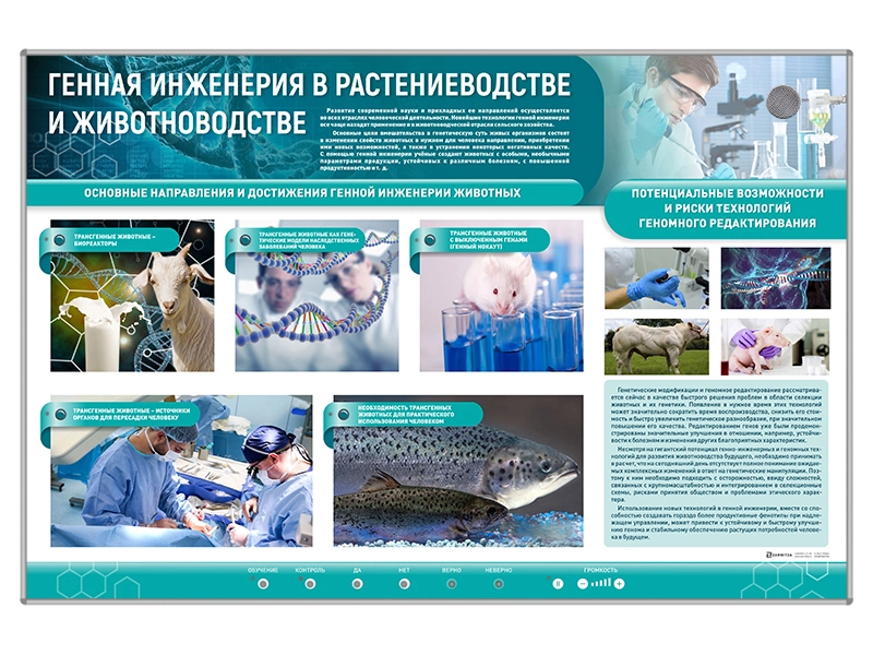 Представляет собой комплект из двух стендов, один из которых иллюстрирует основные понятия о генной инженерии в растениеводстве, а другой основные понятия о генной инженерии в животноводстве.