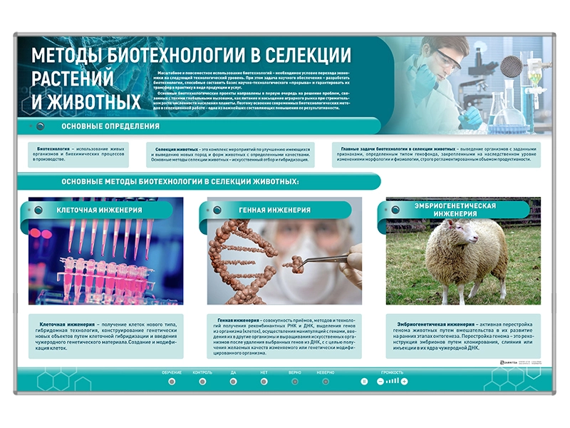Представляет собой комплект из двух стендов, один из которых иллюстрирует основные понятия о методах биотехнологии в селекции растений, а другой основные понятия о методах биотехнологии в селекции растений животных.