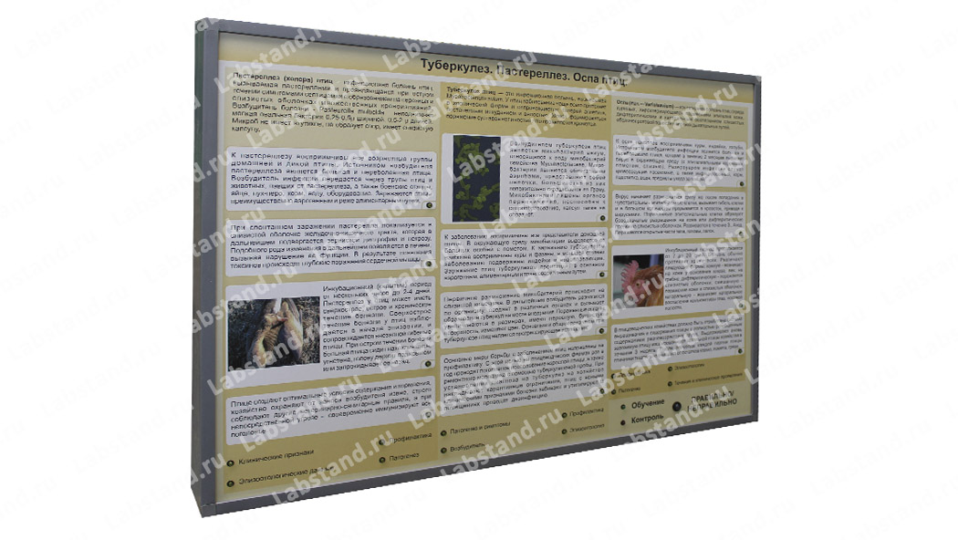 Описание: Стенд-планшет представляет собой каркасную конструкцию, на лицевой панели которой наклеена пленка с изображением информации об инфекционной болезни Туберкулез. Пастереллез. Оспа птиц.