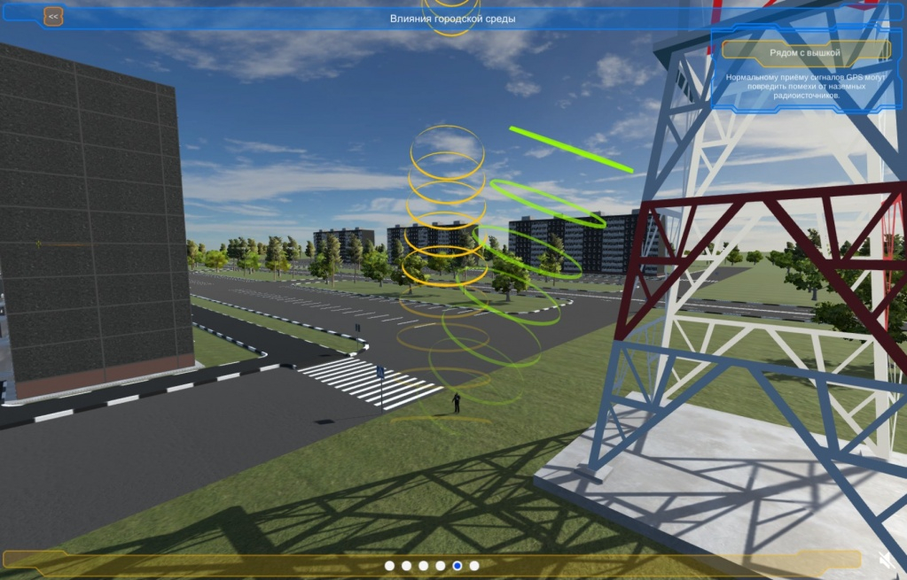 «Факторы, влияющие на точность определения координат» представляет собой интерактивную модель с возможностью выбора различных условий приёма сигнала от спутников с описанием их влияния на определение местоположение.