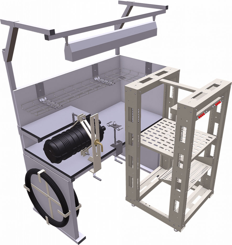 Стенд представляет собой рабочую площадку, которая включает в себя телекоммуникационную стойку, а также освещенное рабочее место монтажника оптоволоконных сетей с оборудованием, макет инженерной конструкции со смонтированным кабельным лотком, двумя устройствами для хранения технологического запаса волоконно-оптического кабеля (ВОК), кронштейн универсальный для закрепления на рабочем столе муфт для удобства проведения монтажных работ, струбциной монтажной для фиксации ВОК в не посредственной близости от оголовника муфты, комплектом инструментов для разделки оптического кабеля, набор компонентов волоконно-оптических систем передачи. Общий размер рабочей площадки – 1,2х1,2х1,2м