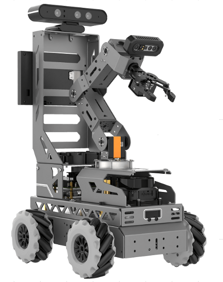 Благодаря четырем всенаправленным механическим колесам возможно движение на 360° без поворотов, а 5-осевой манипулятор с камерой технического зрения может осуществлять захват, сортировку и перемещение объектов. Робот оснащен лидаром и поддерживает картографическую навигацию SLAM, 6-канальный микрофонный массив дальнего действия и динамики поддерживают позиционирование источника звука, управление распознаванием голоса, голосовую навигацию, оснащен камерой глубины и может эффективно воспринимать изменения окружающей среды, что позволяет интеллектуально взаимодействовать с людьми. Исследовательский уровень: Знакомство со сложной кинематикой, основы тригонометрии, углубленное изучение текстовых языков программирования, изучение физических основ работы датчиков. Продвинутый уровень: Изучить алгоритмы поиска пути: A*, Dijkstra, RRT, PRM, Развитие навыков планирования движения: локальное и глобальное планирование, планирование траекторий. Распознавания графических маркеров, распознавание массивов линий и элементов дорожных знаков и разметки, картография, распознавание направления источника звука. Способы использования роботов и глубокого обучения для автоматизации различных процессов. Визуализация облака точек.Возможности набора: