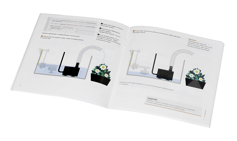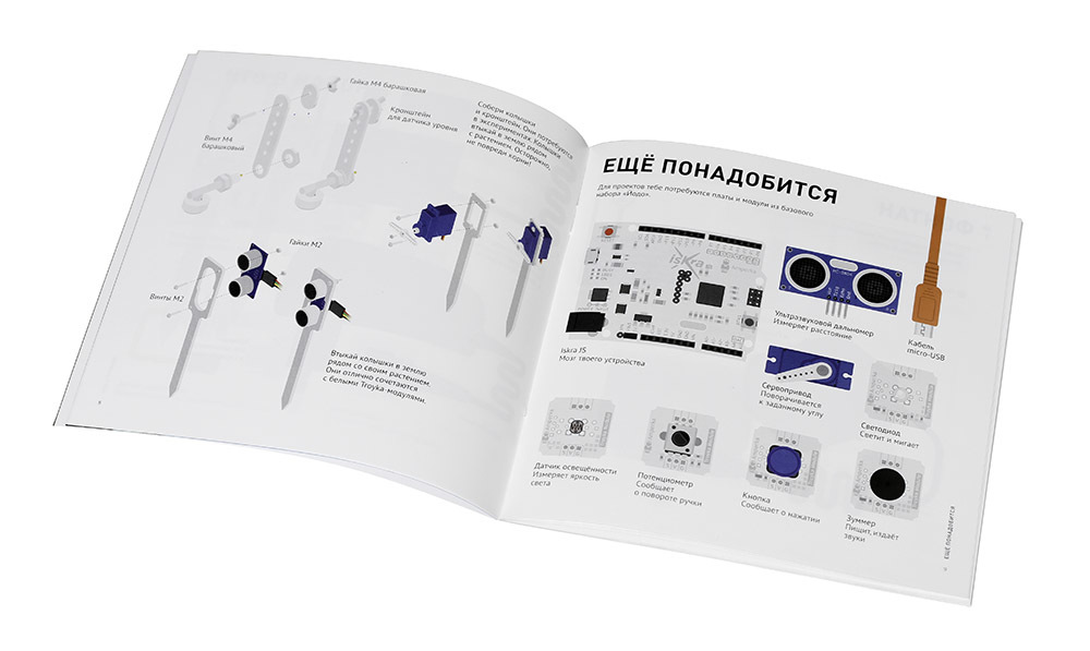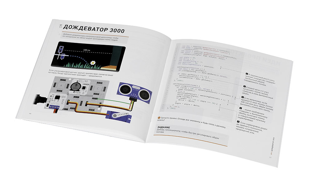 Как обычно, в красочном буклете приведены схемы устройств, код программ с подробными комментариями, интересные факты и дополнительные задания.