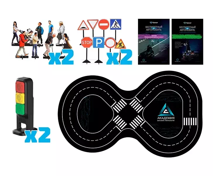Объекты полигона максимально приближены к существующим для того, чтобы учащиеся могли писать программы по детектированию, распознаванию и реагированию на реальные объекты городской среды: дорожные знаки, пешеходов, светофор и двигаться по реальной дорожной разметке. Покрытие поля выполнено таким образом, чтобы камера хорошо считывала трассу. Бликование поля отсутствует! В набор входит: