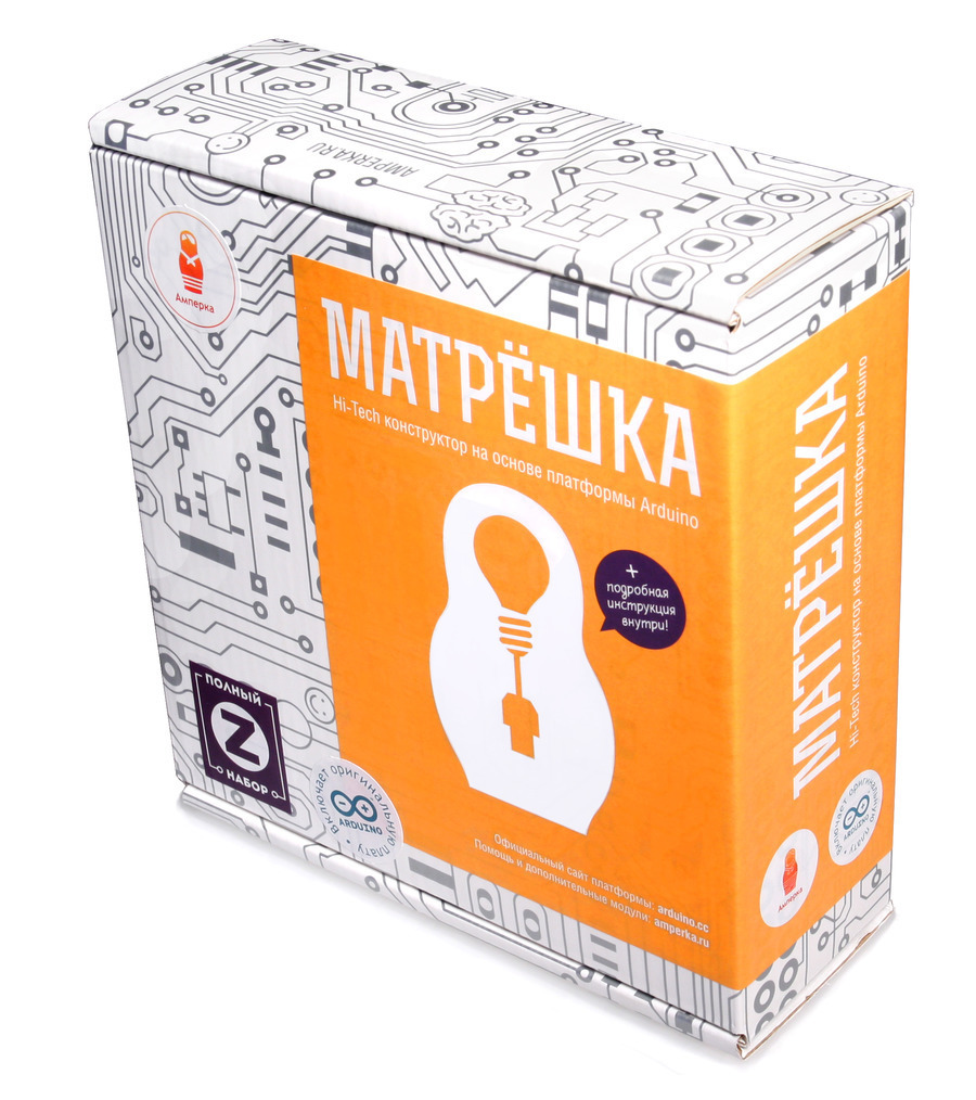 Если вы хотите начать работать с Arduino, но у вас нет опыта и нет базовых радиодеталей и приспособлений, набор «Матрёшка» — это лучший выбор. В нём вы найдёте самую распространённую платформу Arduino Uno, набор радиодеталей, провода, макетную плату, а самое главное — красочную лаконичную обучающую брошюру, которая с нуля научит вас делать собственные электронные устройства.