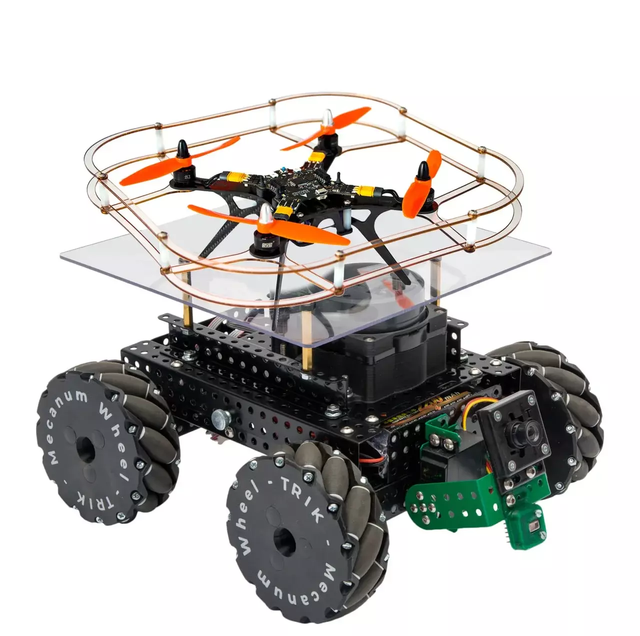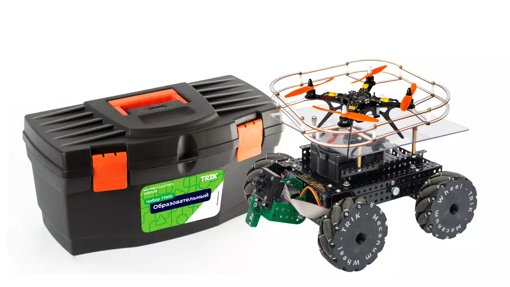 Основа набора - это полноприводная четырехколесная платформа, с возможностью установки меканум колес, обеспечивающими всенаправленное движение робота. В комплект входит квадрокоптер Геоскан Пионер в базовой комплектации, которую можно расширить за счет дополнительных модулей. Также в комплект ТРИК Геоскан Расширенный входит лидар, с помощью которого можно создавать 2D карту помещений и тепловизор, позволяющий наблюдать и анализировать распределение температуры различных объектов.