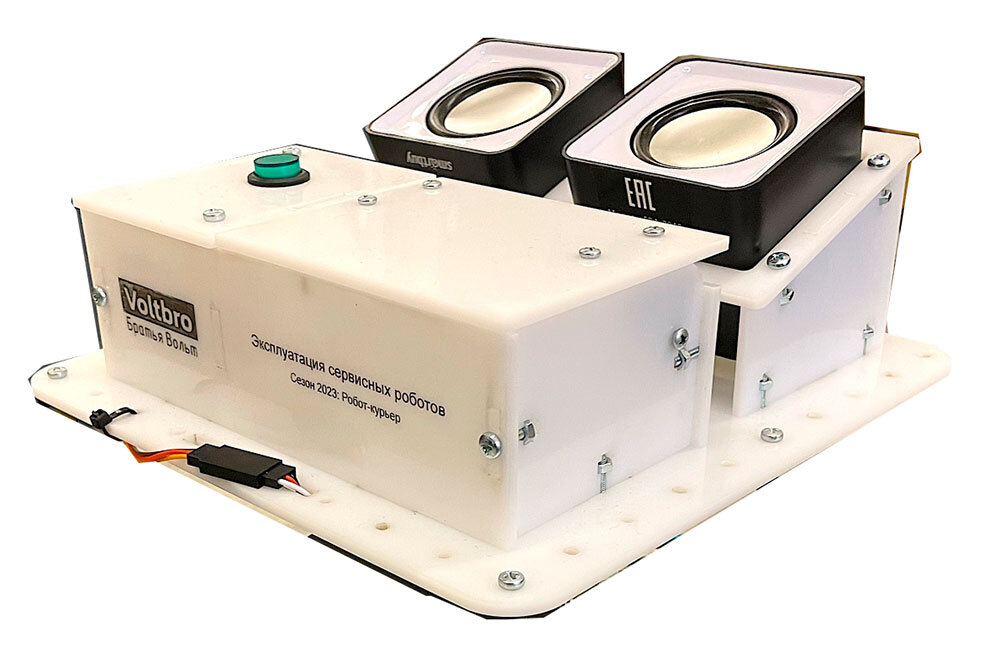 Образовательный комплект включает в себя колесного робота в сборе и набор оборудования для подготовки к соревнованиям по компетенции "Эксплуатация сервисных роботов" всероссийского чемпионатного движения "Профессионалы" и "Абилимпикс".