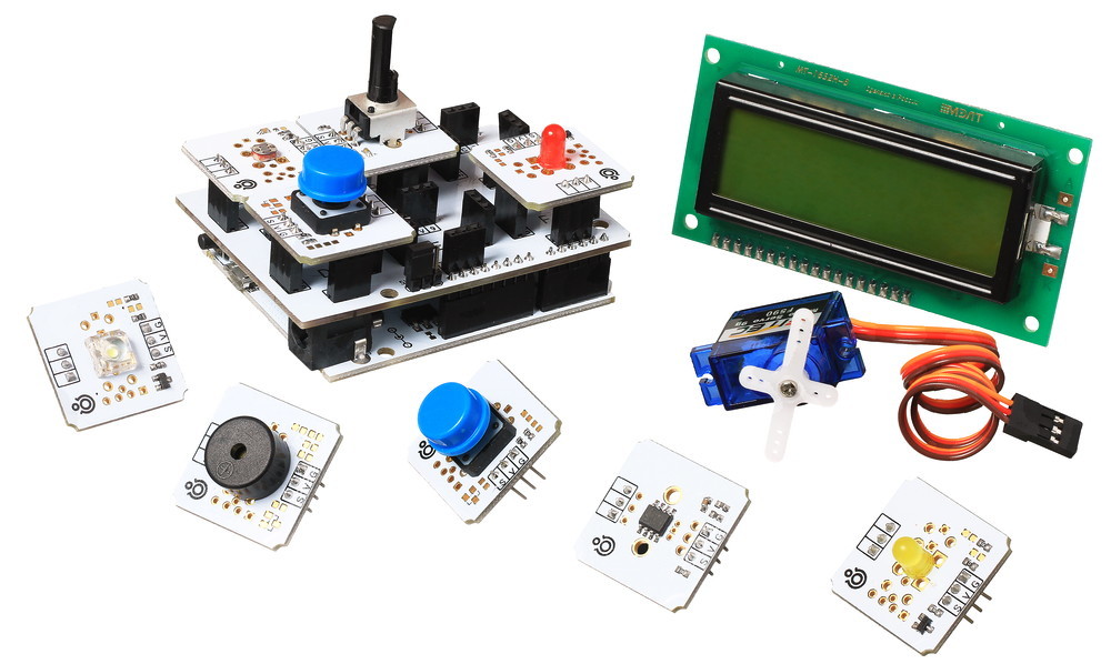 Мозгом набора является Iskra Neo — Arduino-совместимая плата, которая производится нами в России. К ней прилагается несколько датчиков и светодиодов, сервопривод и дисплей. Готовые модули легко соединяются между собой без пайки и ухищрений.
