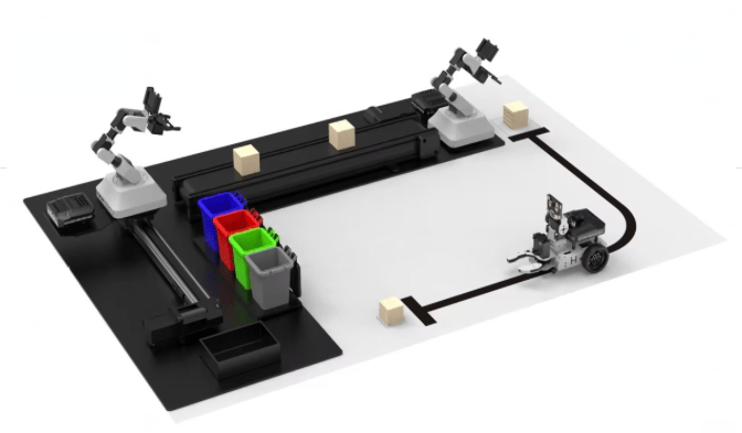 Учебно-лабораторный комплект предназначен для разработки гибких модульных автоматизированных линий на основе синхронизированных друг с другом конвейерных линий, манипуляторов и мобильного автономного робота с камерой технического зрения. Управление конвейерными линиями может осуществляться с помощью программируемого контроллера, а также посредством предачи сигнала через bluetooth.