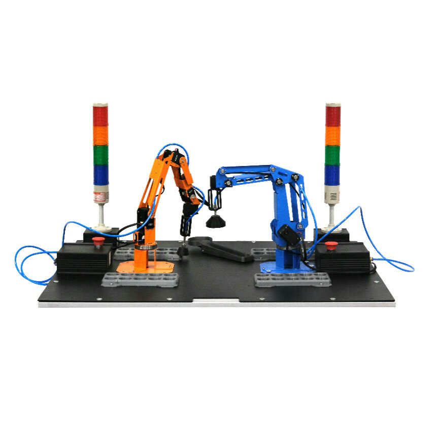 Учебный комплект представляет собой макет производственной линии на базе манипуляционных роботов различного типа, а также дополнительного оборудования, имитирующих реальное производственное оборудование и управляемое с помощью профессиональных решений, применяемых в промышленности. 1) Учебный манипулятор с угловой кинематикой - 1 шт 2) Учебный манипулятор с плоско-параллельной кинематикой - 1 шт Учебные манипуляторы представляют собой уменьшенную программируемую модель промышленных манипуляционных роботов с наиболее распространенными в промышленности кинематическими схемами. Учебный манипулятор с угловой кинематикой применяется для демонстрации наиболее распространенных производственных операций (сварка, покраска, обработка контуров и т.п.), а манипулятор с плоско-параллельной кинематикой применяется для демонстрации операций паллетирования и транспортировки грузов. Манипуляционный робот выполнен на основе интеллектуальных сервоприводов с интегрированной системой управления и датчиками обратных связей по положению, скорости, нагрузки и т.п. В состав учебных манипуляционных роботов входит программируемый контроллер для управления моделью манипулятора с помощью наиболее востребованных в образовательном процессе средств разработки - Arduino IDE, C\C++ и Python, среде разработки ROS (Robot Operation System). Таким образом, учебный манипуляционный робот представляет собой комплексное решение по многоэтапному изучению робототехники по принципу «от простого к сложному» и решения образовательных задач в школе, колледже и имитации производственных задач.Состав: