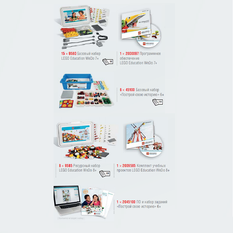 Комплект для начальной школы от LEGO Education отлично подойдёт для класса из 30 учеников. Комплект включает в себя лучшие решения для начальной школы от LEGO Education: Перворобот Wedo и Построй свою историю. Этот набор для занятия в классе на 30 учеников включает в себя все необходимое для проведения занятий: базовые и доп. наборы, программное обеспечение, доп. задания.