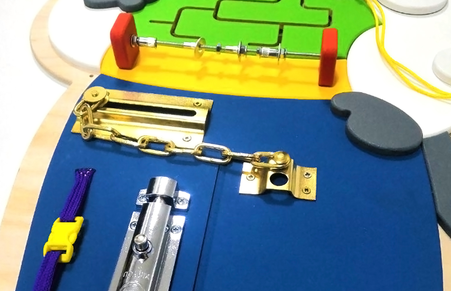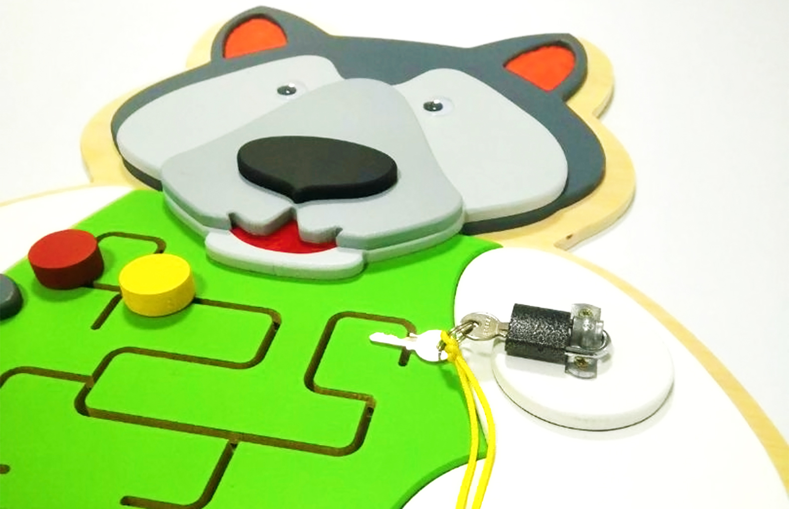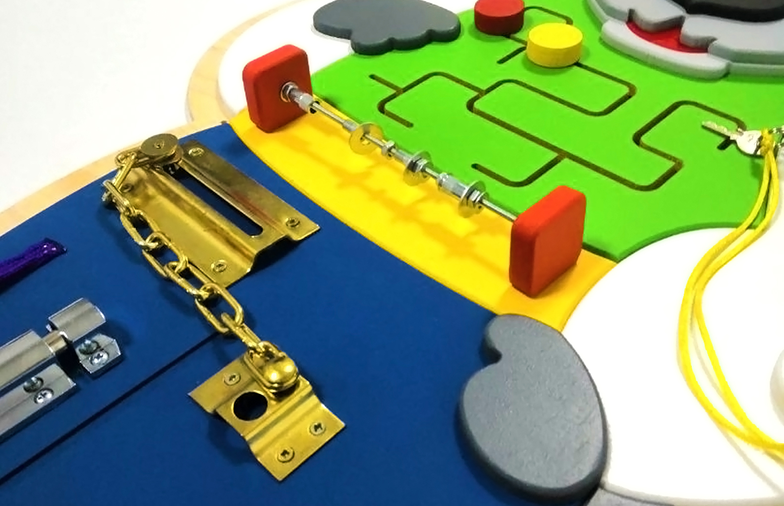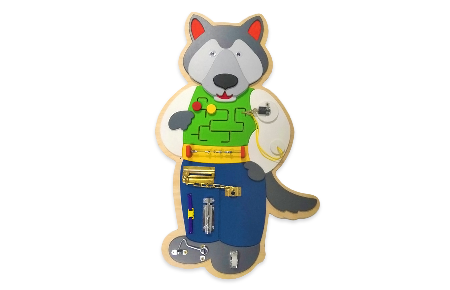 Бизиборд «Волчок-серый бочок» оснащен множеством подвижных деталей, способствующих развитию мелкой моторики и логического мышления. Данный бизиборд также поможет ребенку освоить навык открывания различных щеколд и замков.