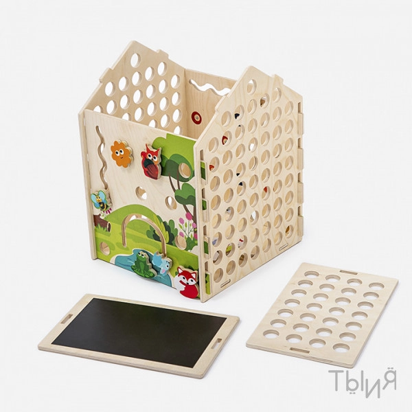 Бизиборд-конструктор "Лес" предназначен для детей от 1 до 5 лет и изготовлен из натуральных материалов — дерева и березовой фанеры.