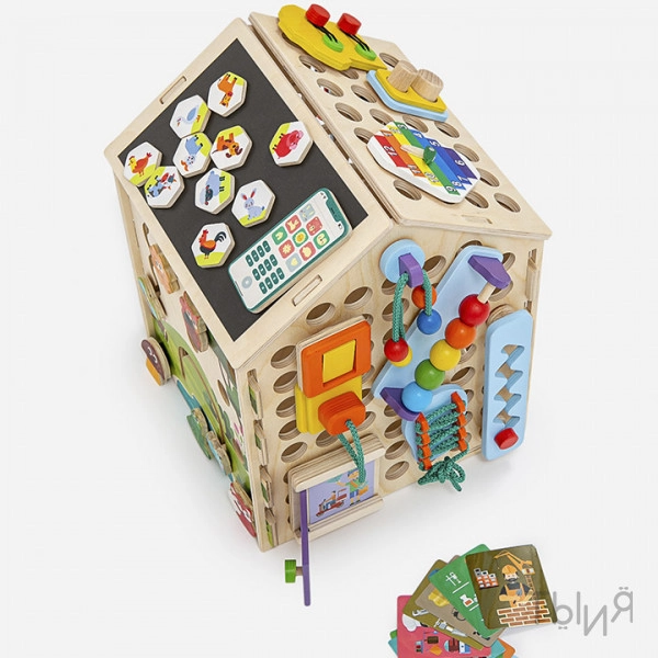 Натуральный деревянный бизидом полностью разборный, что позволяет переставлять локации по желанию и брать их с собой в путешествия. Элементы можно крепить на крыше конструктора, чтобы они всегда были под рукой. Игрушку также можно использовать как ночник и ящик для хранения мелких игрушек.