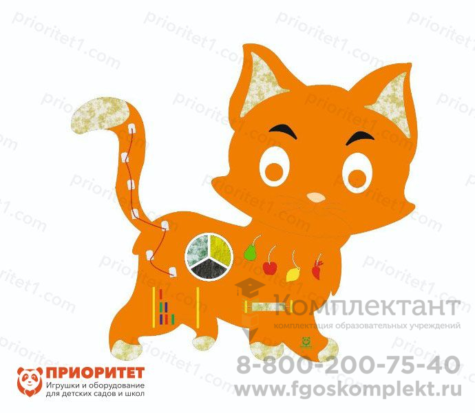 - Бизиборд выполнен в ярких цветах, в виде очаровательной кошечки, что вызывает положительный эмоциональный отклик у ребенка.