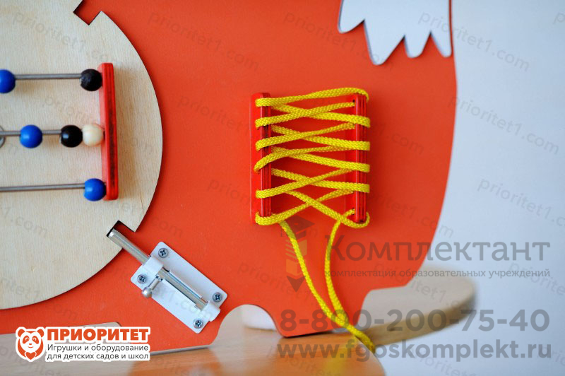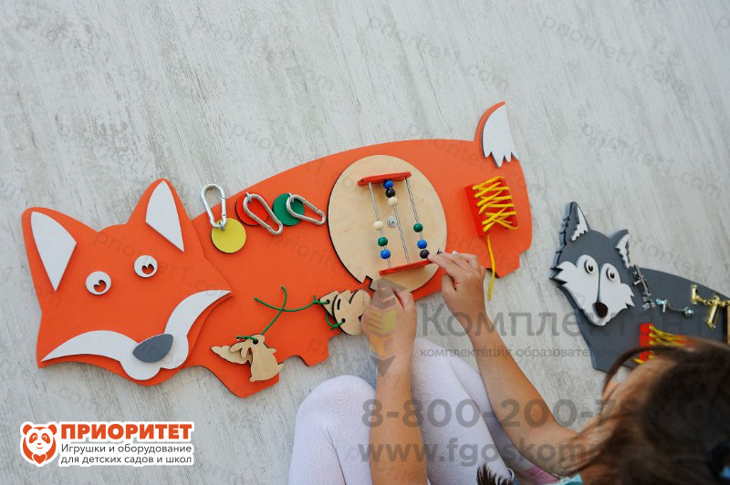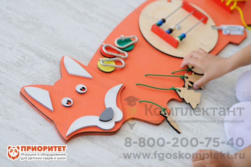 Бизиборд выполнен в виде яркой заманчивой лисички. Любопытная лисица проявит в ребятишках интерес к учебе и соревновательный дух. Дети не только физически и умственно развиваются, но и учатся самостоятельности в домашних делах. На панели расположены элементы, часто привлекающие детское внимание. Главный плюс – эффективное развитие и безопасное удовлетворение детского любопытства. Бизиборд предназначен для проведения развивающих игр в дошкольных образовательных учреждениях, коррекционных центрах и т.д.