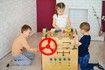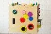 - Вращающиеся детали. Занятия с вращающимися барабанами, дисками и рулями способствуют развитию мелкой моторики, координации движений, знакомят с механизмами движения предметов. Каждую деталь можно покрутить, представляя себя водителем машины за рулем, или катать игрушки на «карусели».