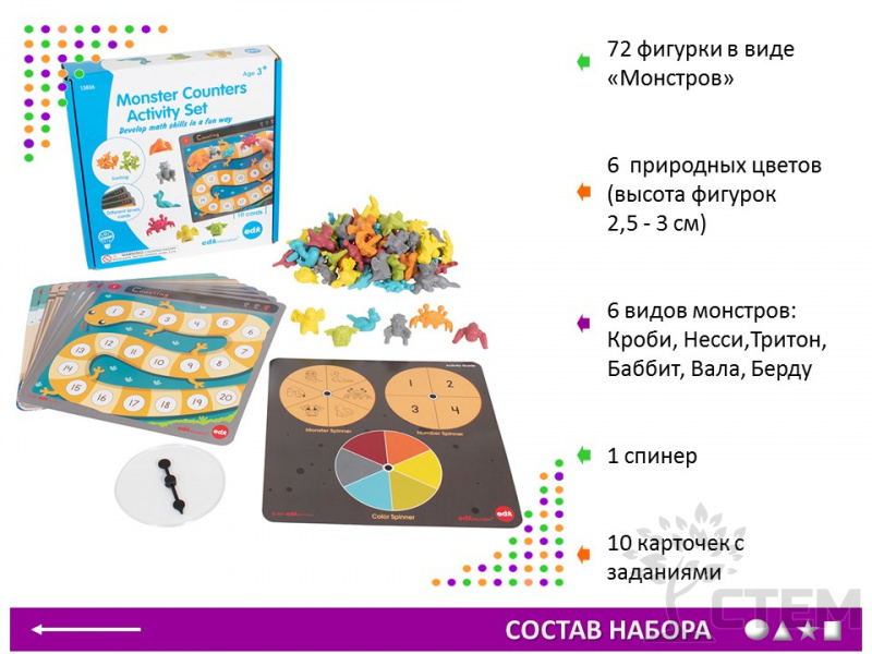 Материал счетный "Монстры" – это набор из 72 фигурок разных видов и цветов, которые помогут детям развить математические навыки и логическое мышление. В комплекте также идут задания для увлекательных уроков и игр.