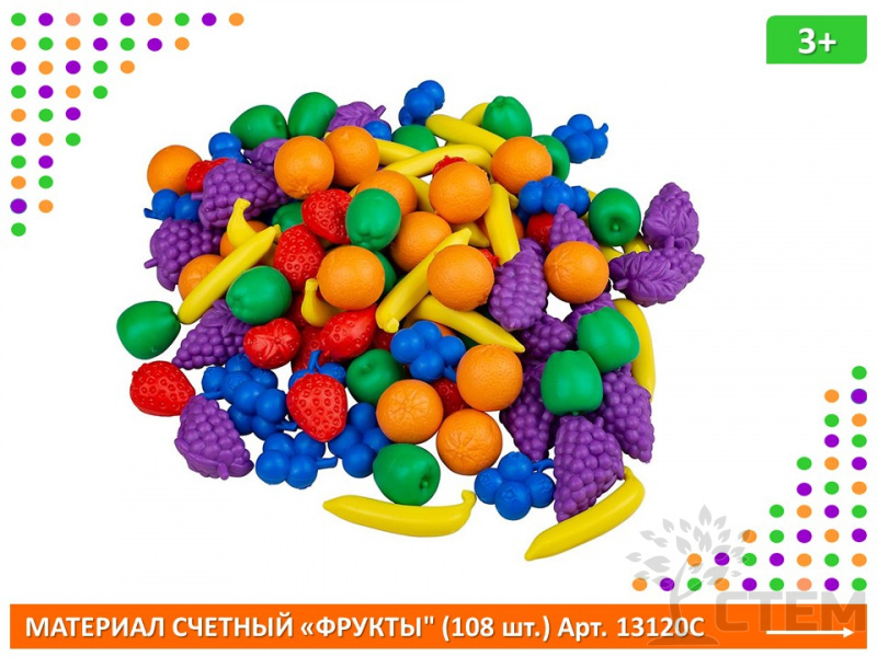 Математический набор "Фрукты" – это 108 красочных счетных фигурок в 6 формах и 6 цветах. Идеально подходит для обучения детей основам математики и развития мелкой моторики.