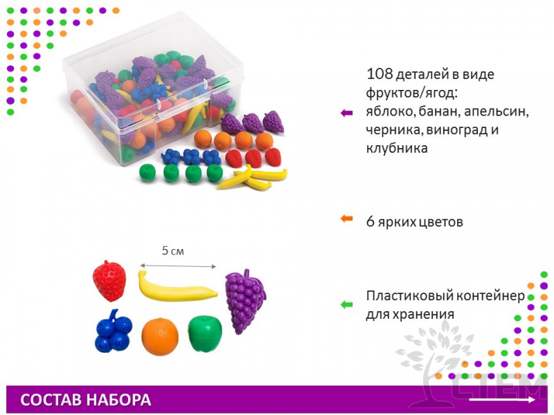 В наборе 108 деталей в виде фруктов, 6 ярких цветов. Фигурки: яблоко, банан, апельсин, черника, виноград и клубника.