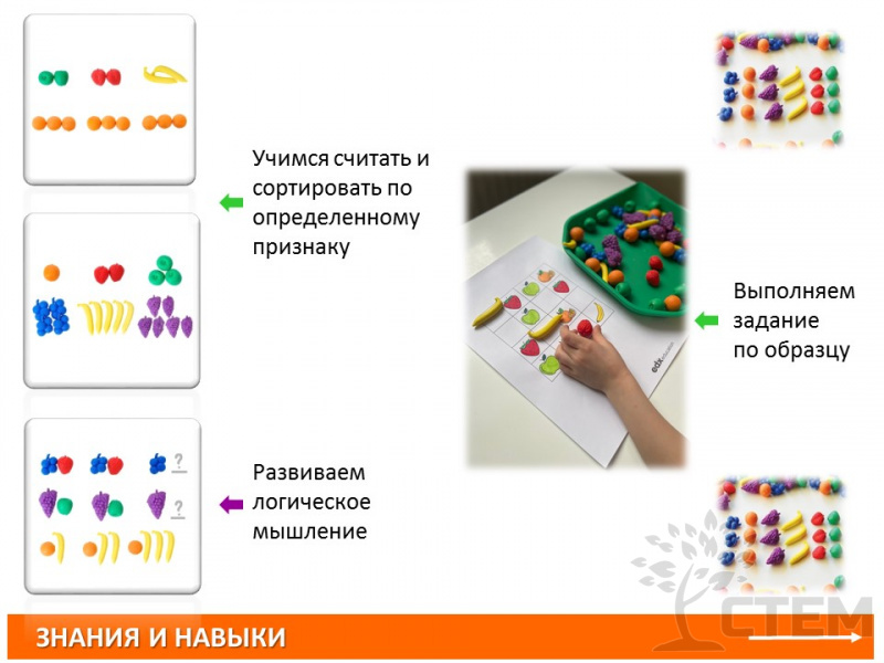 необходимо получать как тактильный физический опыт, играя с реальным счетным материалом, так и опыт с применени-