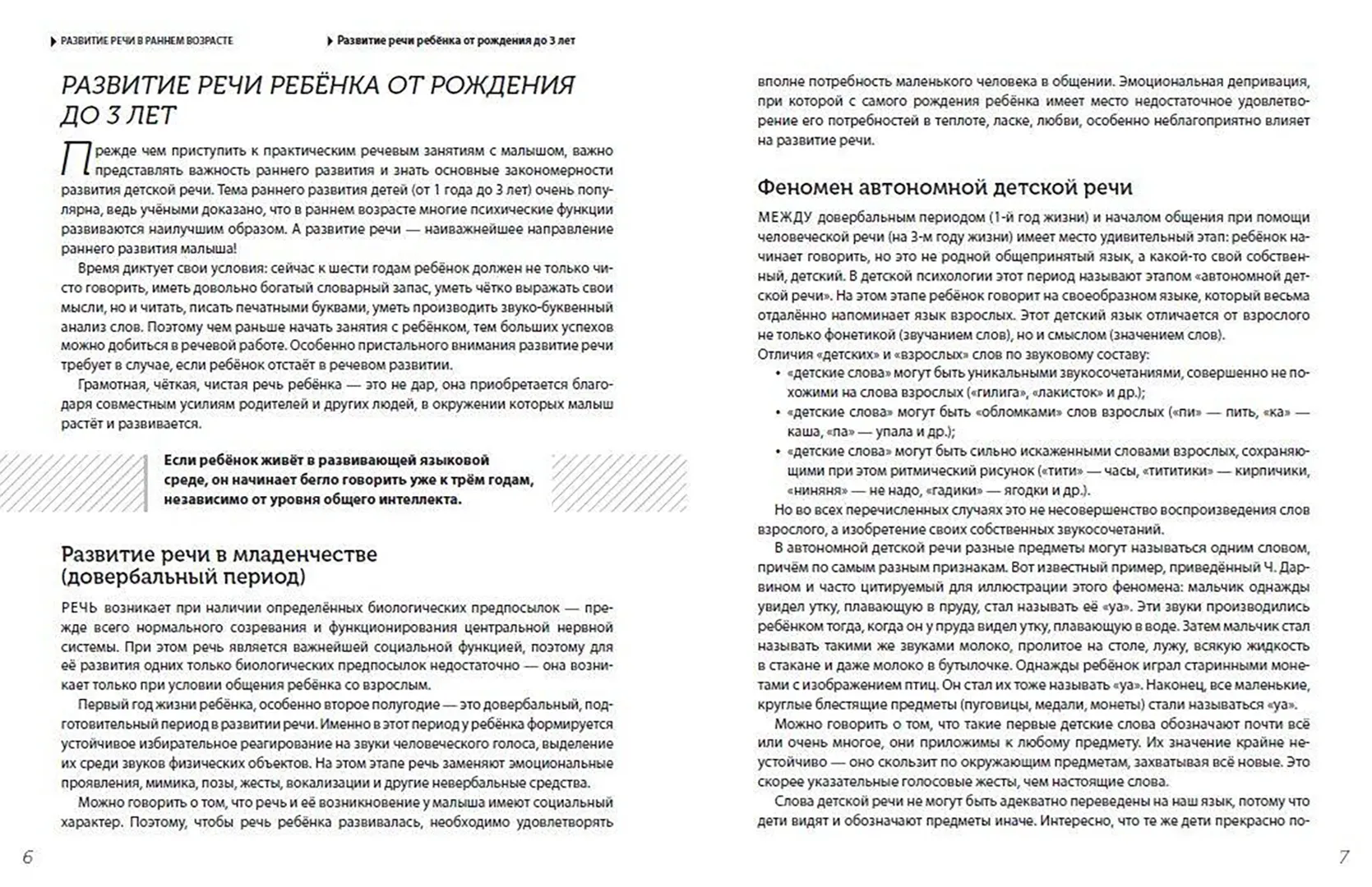 В её книге вы найдёте множество предметных игр, нацеленных на развитие речи, примеры бесед по предметным и сюжетным картинкам, специальные приёмы развития активной речи, а также описания особенностей развития речи мальчиков и девочек. Все игры и приёмы сопровождаются подробными комментариями и описаниями.