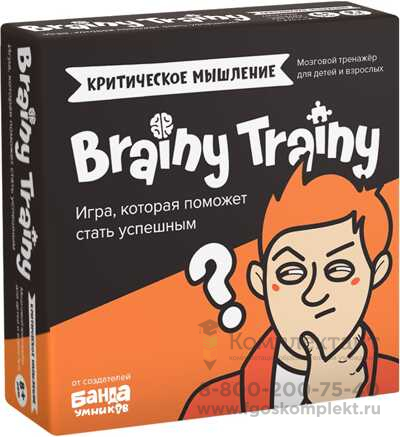 Игра-головоломка Критическое мышление, арт. УМ546 \"Этому не научат в школе! Уникальная методика Brainy Trainy помогает детям развивать ключевые навыки будущего, или Soft Skills. Именно они необходимы для успеха в учебе, общении и карьере. Гибкие навыки помогут ребенку стать лидером среди сверстников и выдающимся профессионалом в будущем. Как мыслить широко и нестандартно? Как находить ответы на самые сложные вопросы? Этому научат авторские задачи на развитие интеллекта от издательства Банда умников. Чтобы не поддаться чужому влиянию, нужно уметь правильно сомневаться, проверять факты на прочность и вовремя понять, когда кто-то пытается ввести нас в заблуждение. В этом и помогает развитое критическое мышление, позволяя выбирать только надежные и безопасные решения. Brainy Trainy Критическое мышление не просто учит решать задачи определенного типа. Уникальная методика позволяет развить широкий репертуар компетенций, необходимых для оценки и обработки входящего потока информации. В результате у ребенка формируется целостный подход к решению любых задач: в том числе тех, с которыми он не сталкивался ранее. Что внутри? В наборе 80 карточек с заданиями. Каждой из них соответствует свой уровень сложности и основная компетенция, которую развивает данный тип заданий. На обороте карты — ответ с обоснованием решения. Типы компетенций в заданиях Интерпретация — умение толковать информацию и делать правильные выводы. Логические уловки аргументации — распознавание манипуляций и способы им противостоять. Когнитивные искажения — анализ суждений, выявление ошибочных субъективных выводов. Дедукция — выявление причинно-следственных связей, оценка общего положения и ситуации для частного вывода. Наблюдательность — внимание к деталям, оценка окружения. Вариативность — способность широко видеть задачу, подходить к решению задач с разных сторон. Категоризация — анализ взаимосвязей и отношений одних объектов к другим с помощью кругов Эйлера. Гипотезы — умение строить гипотезы и проверять их на прочность. Занимайтесь с ребенком индивидуально или устройте интеллектуальный турнир! Индивидуальный тренинг позволяет ребенку максимально сконцентрироваться на задании и дает время обдумать решение. Это базовый вариант игры, при котором мы советуем давать ребенку не больше 5 карт с заданиями, чтобы ему всегда хотелось еще. При таком варианте, хорошо выбрать несколько дней в неделю для регулярных занятий. Интеллектуальный турнир — это соревновательный вариант игры для компании любого размера. Разделите группу детей на команды из 2-5 человек и устройте соревнование! В комплекте 80 карт с задачами и ответами Иллюстрированные правила\"