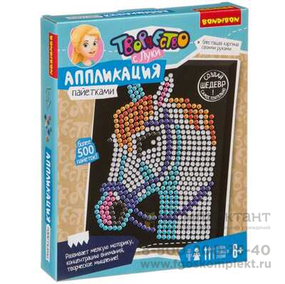 Набор для творчества Аппликация пайетками Лошадь , арт. ВВ3814 Аппликация пайетками - увлекательный процесс и гарантированно блестящий результат! Набор включает: бархатную основу из картона с нанесенной схемой, объемную основу из вспененного материала, красочные пайетки и гвоздики для крепления. В процессе работы развивается мелкая моторика, концентрация внимания, творческое мышление!