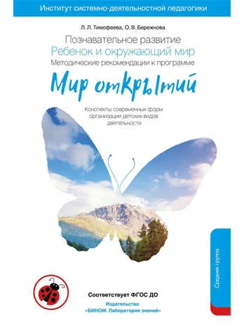 Познавательное развитие. Ребенок и окружающий мир. Методические рекомендации к программе \"Мир открытий\". Средняя группа детского сада. Бережнова О.В. Пособие входит в базовый методический комплект Комплексной образовательной программы дошкольного образования «Мир открытий» (Под ред. Петерсон Л. Г., Лыковой И. А.), обеспечивает реализацию двух направлений деятельности педагогов с детьми средней группы в рамках образовательной области «Познавательное развитие»: формирование у дошкольников целостной картины мира, расширение кругозора; развитие познавательно-исследовательской деятельности. В издании представлены методические рекомендации по ознакомлению детей 4 — 5 лет с окружающим миром, содержание и система планирования работы по разделу, конспекты современных форм организации детских видов деятельности. В приложении даны примеры детских проектов познавательной направленности. Пособие предназначено для использования в дошкольных группах образовательных организаций, реализующих образовательные программы дошкольного образования, в том числе семейных группах и группах кратковременного пребывания. Материалы издания адресованы педагогическим работникам дошкольных образовательных организаций, преподавателям и студентам педагогических вузов, колледжей, специалистам методических служб, родителям. Пособие выходит в комплекте с изданиями для детей средней группы детского сада (4-5 лет): Тимофеева Л.Л. «От лета до лета. Ребенок и окружающий мир. Альбом наблюдений. 4-5 лет»