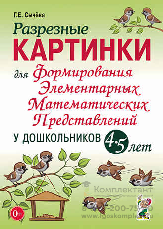 Разрезные картинки для формирования элементарных математических представлений у дошкольников 4–5 лет. Сычева Г.Е. Пособие содержит разрезные картинки для организации и проведения образовательной деятельности, направленной на формирование элементарных математических представлений (ФЭМП) у дошкольников 4–5 лет в дошкольных образовательных организациях (ДОО). Адресовано педагогам дошкольных образовательных организаций, центров развития детей дошкольного возраста, родителям и гувернерам для домашнего обучения.