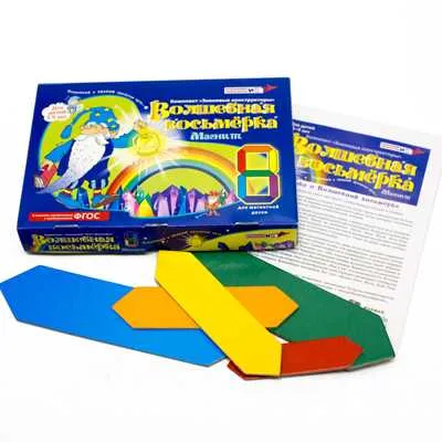 Волшебная восьмерка Магнит Конструктор в картонной коробке (их цветного картона): 3 набора по 10 разноцветных \"лепестков\" на магнитах трех размеров: красный, оранжевый, желтый, зеленый, голубой, синий, фиолетовый, белый, серый и черный. Развитие сенсорных способностей (цвет, форма), творческое конструирование, развитие моторики руки, формирование пространственных представлений, математических понятий. Возраст: 3-7 лет.