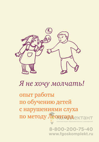 Я не хочу молчать! Опыт работы по обучению детей с нарушениями слуха по методу Леонгард. Леонгард Э.И., Самсонова Е.Г., Иванова Е.А. В книге представлен практический опыт абилитации и реабилитации глухих и слабослышащих детей дошкольного и школьного возраста в разных условиях воспитания и обучения – в семье, в детском саду и в школе. Данный опыт базируется на теории, лежащей в основе психолого-педагогической «Системы формирования и развития речевого слуха и речевого общения у детей с нарушением слуха», существующей с 1966 года. Книга предназначена сурдопедагогам и воспитателям специальных дошкольных групп, специальных дошкольных учреждений и всем, кто имеет отношение к воспитанию и обучению глухих и слабослышащих детей, а также родителям. Может быть интересна психологам, педагогам и воспитателям, работающим со слышащими дошкольниками, и родителям слышащих детей.