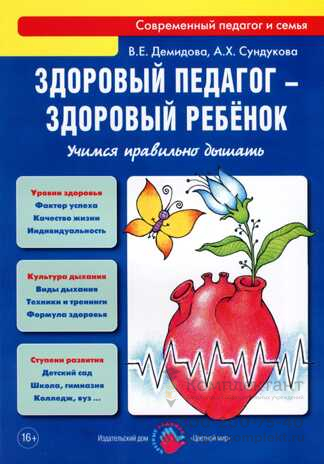 Здоровый педагог - здоровый ребенок. Учимся правильно дышать Учебно-методическое пособие впервые раскрывает взгляд на здоровье как важнейший фактор успешности образовательного процесса и профессиональной самореализации педагога. Содержит следующие модули \"Индивидуальный уровень здоровья\", \"Культура дыхания\". Предлагает конкретные рекомендации для освоения правильного дыхания во время сна, еды, разговора, физической нагрузки. Учебно-методическое пособие описывает специальные техники дыхания. Позволит освоить практические навыки оценивания, сохранения и приумножения здоровья. Содержит ряд Приложений для осмысления изложенного материала. Важнейшие рекомендации даны в оригинальной и увлекательной форме. Адресуется воспитателям и руководителям детских садов, учителям начальной, средней и высшей школы, студентам педагогических колледжей и вузов, гувернерам, родителям. Будет интересна и полезна всем, кто хочет быть здоров и готов для этого действовать.