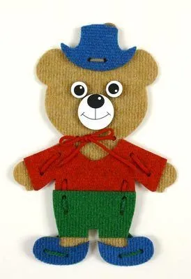 Детская развивающая игра Шнуровка "Медвежонок" состоит из Медвежонка и одеждыдля него (шляпы, рубашки, штанишек, ботинок). Одежда 3-х цветов: зеленого, синего, красного, желтого.
