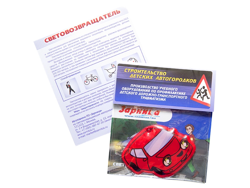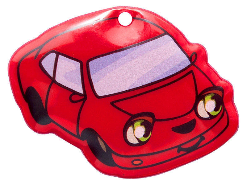 Световозвращающая подвеска высокого качества представляет собой элемент в виде автомобиля, выполненный из скрепленного между собой эластичного световозвращающего материала. Коэффициент световозвращения поверхности подвески составляет 200 кд/лк*м2 согласно требованиям ГОСТ Р 50971-2011. Цвет световозвращающего материала - красный. На лицевой стороне подвески с применением УФ-печати нанесен цветной тематический рисунок, соответствующий возрастной категории (дошкольники и школьники): "Машинка".