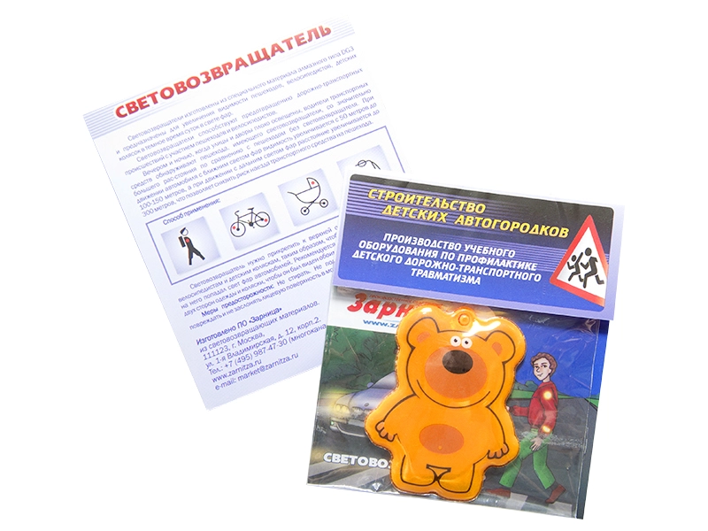 Световозвращающая подвеска высокого качества представляет собой элемент в виде медвежонка, выполненный из скрепленного между собой эластичного световозвращающего материала. Коэффициент световозвращения поверхности подвески составляет 200 кд/лк*м2 согласно требованиям ГОСТ Р 50971-2011. Цвет световозвращающего материала - оранжевый. На лицевой стороне подвески с применением УФ-печати нанесен цветной тематический рисунок, соответствующий возрастной категории (дошкольники и школьники): "Медвежонок".
