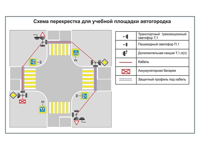Учебные площадки с переносным оборудованием предназначены для обучения учащихся дошкольных и школьных общеобразовательных учреждений навыкам безопасного поведения на дорогах, с использованием методических рекомендаций по изучению правил дорожного движения. Учебная площадка располагается на асфальтированной поверхности площадью от 100 м2 и оборудуется электрифицированными светофорами. Возможна установка нескольких учебных площадок (перекрестков) на одной территории с их объединением в общую дорожную инфраструктуру. Оборудование учебной площадки (светофоры, дорожные знаки) устанавливается на поверхность на переносные утяжеленные основания, что обеспечивает сохранность покрытия и возможность производить полный демонтаж всего оборудования после окончания практических занятий.