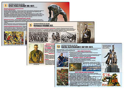 Пособие состоит из 12 полноцветных таблиц, ламинированных глянцевой пленкой.Таблицы: 1. Первая Русская революция 1905–1907 гг. 2. Столыпинская аграрная реформа (1906–1911 гг.). 3. Серебряный век русской культуры. 4. Политические партии в России в начале XX в. 5. Февральская революция 1917 г. 6. Октябрьская революция 1917 г. 7. Гражданская война и интервенция в России 1918–1922 гг. 8. Политика "военного коммунизма" и "новая экономическая политика". 9. Политика коллективизации в СССР 1928–1937 гг. 10. Политика индустриализации в СССР 1928–1937 гг. 11. Великая Отечественная война 1941–1945 гг. 12. Внешняя политика конца XX – начала XXI вв.