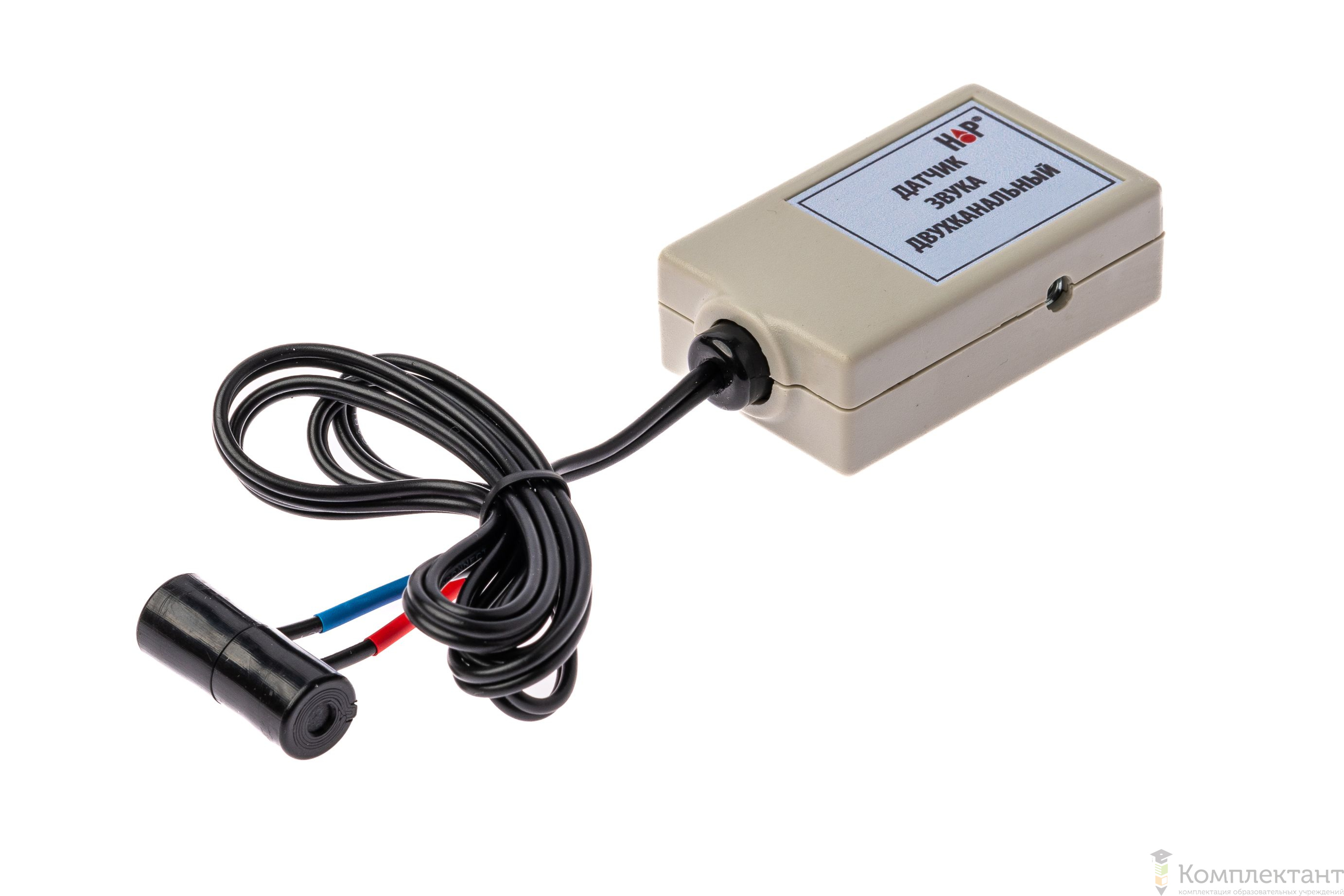 Цифровой датчик звука двухканальный состоит из электронного блока и 2 микрофонов, соединенных кабелями с электронным блоком.