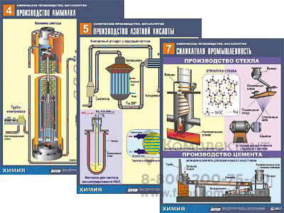 Комплект охватывает следующие темы: "Способы сжигания топлива", "Производство серной кислоты", "Производство аммиака", "Производство азотной кислоты", "Производство аммиачной селитры", "Силикатная промышленность", "Электролиз хлорида натрия", "Получение алюминия", "Химия доменного процесса", "Производство чугуна", "Конвертер с кислородным дутьем". "Выплавка стали в электропечи", "Выплавка стали в электронно-лучевой печи", "Обогащение руд флотацией", "Обжиг известняка".