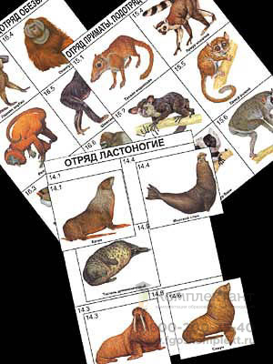 Наглядно-дидактическое пособие представляет собой комплект из 96 карточек с изображениями млекопитающих и 32 планшетов для их размещения по систематическим (16 планшетов) и экологическим (16 планшетов) группам. В комплект включены млекопитающие, ознакомление с которыми предусмотрено разделом “Животные” школьного курса биологии.