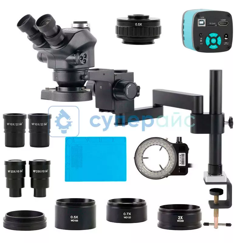 тринокулярная головка – 1 шт; окуляры – 4 шт; пылезащитная насадка - 1 шт; адаптер 0,5х - 1 шт; объективы - 3 шт; пылезащитный чехол - 1 шт; термостойкий коврик для стола - 1 шт; источник света - 1 шт; камера - 1 шт; USB кабель - 1 шт; HDMI кабель - 1 шт; адаптер питания - 1 шт; руководство пользователя - 1 шт |